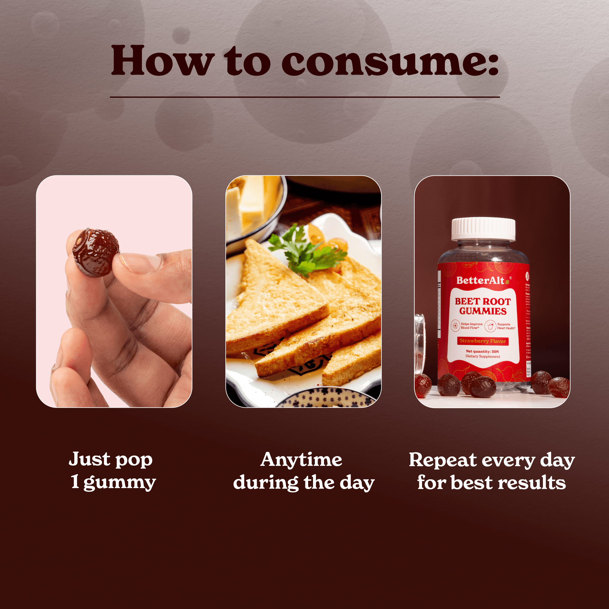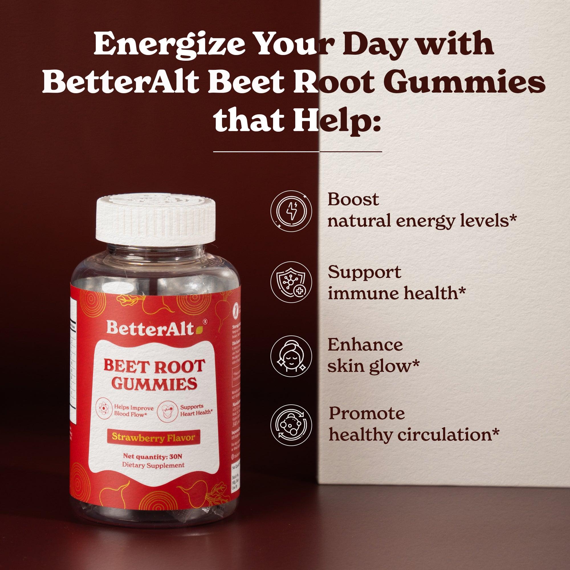 - BetterAlt Beet Root Gummies combine pure beetroot powder with a delicious strawberry flavor, designed to help support your daily energy and wellness routine in a fun, easy-to-take format.