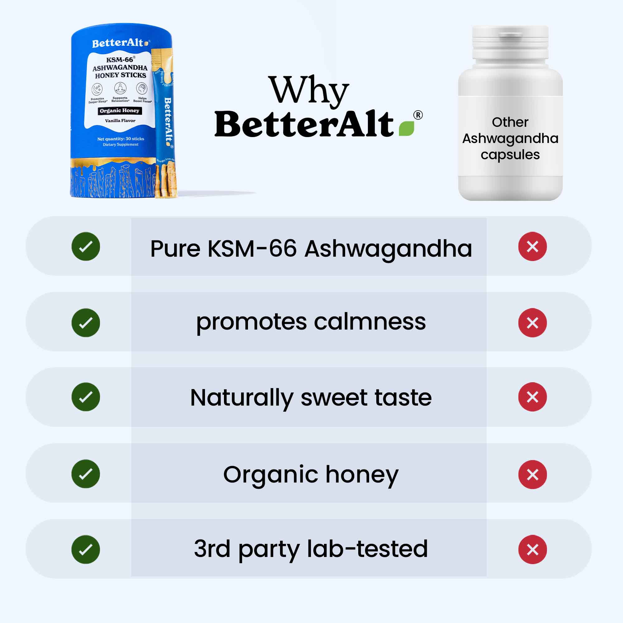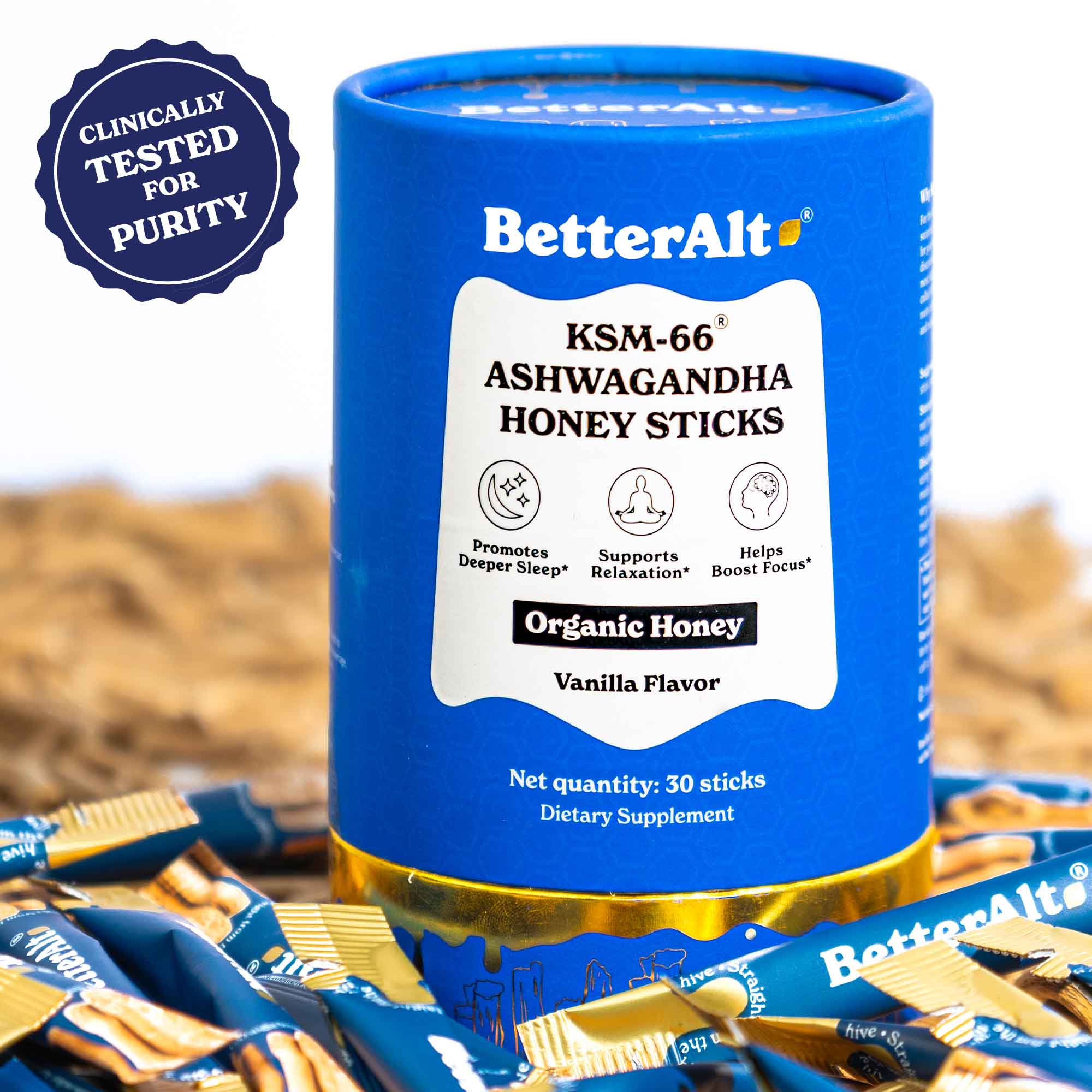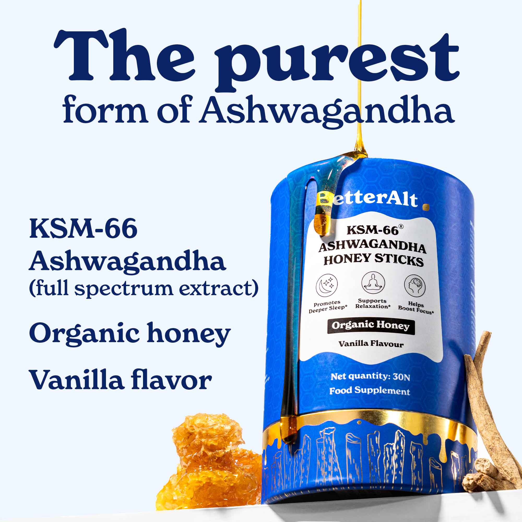 - BetterAlt’s KSM-66 Ashwagandha Honey Sticks are an easy and delicious way to unwind and support your mental and physical well-being. These honey sticks combine the power of 400 mg of KSM-66 Ashwagandha with organic Himalayan multiflora honey and a touch of natural vanilla flavor to promote relaxation, improve focus, and support restful sleep.