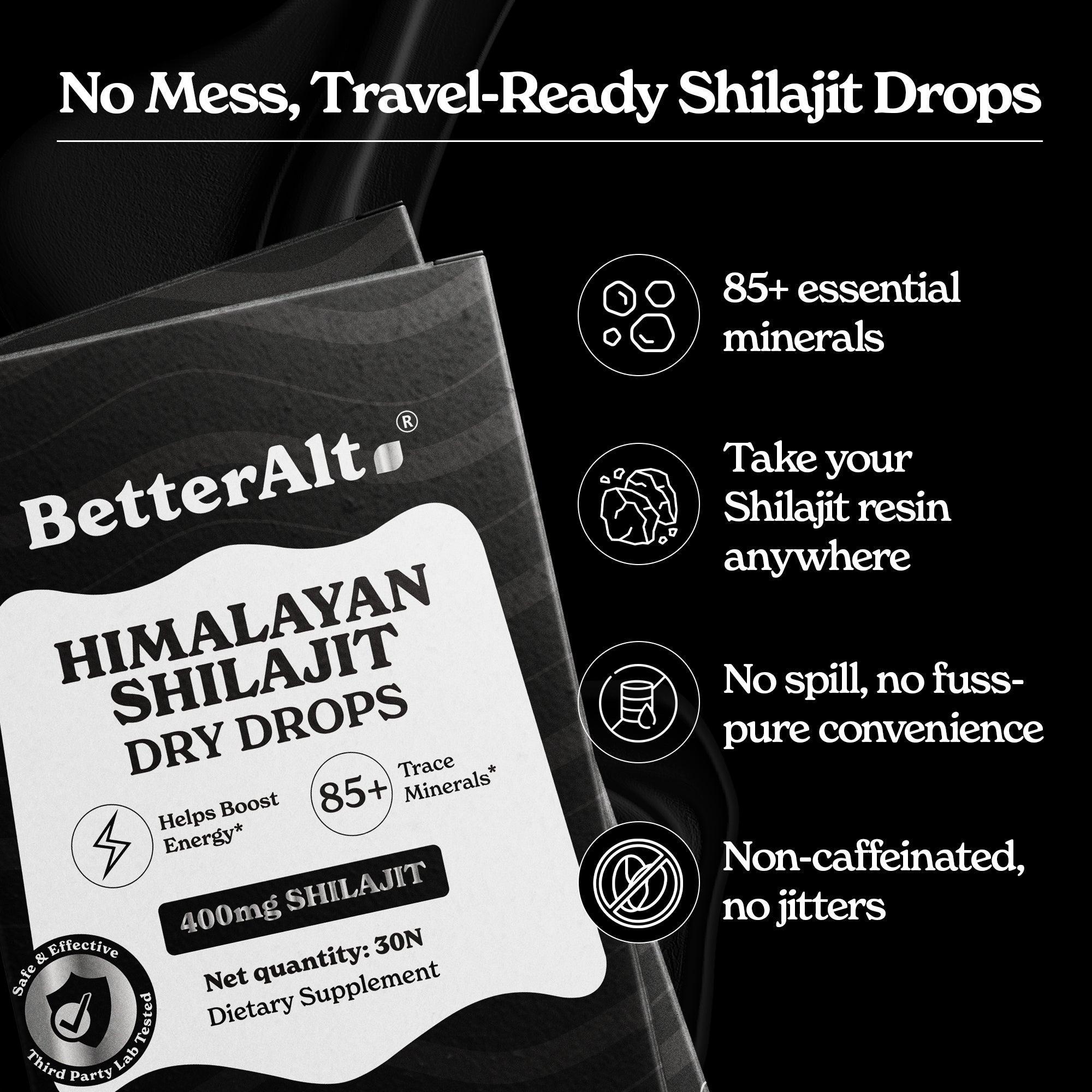 - Experience the power of nature with BetterAlt’s Shilajit Dry Drop Tablets. Each tablet contains 400 mg of pure Himalayan Shilajit resin, packed with over 85 essential minerals to help support sustained energy, enhance stamina, improve focus, and reduce feelings of fatigue.