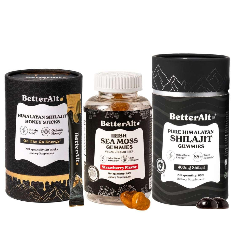 Fight winter fatigue and stay energized with our carefully curated Winter Immunity Pack! Combining three powerhouse supplements—GOLD+ Shilajit Honey Sticks, Shilajit Gummies, and Irish Sea Moss Gummies—this pack is designed to enhance your vitality, strengthen immunity, and keep you feeling your best during the colder months.