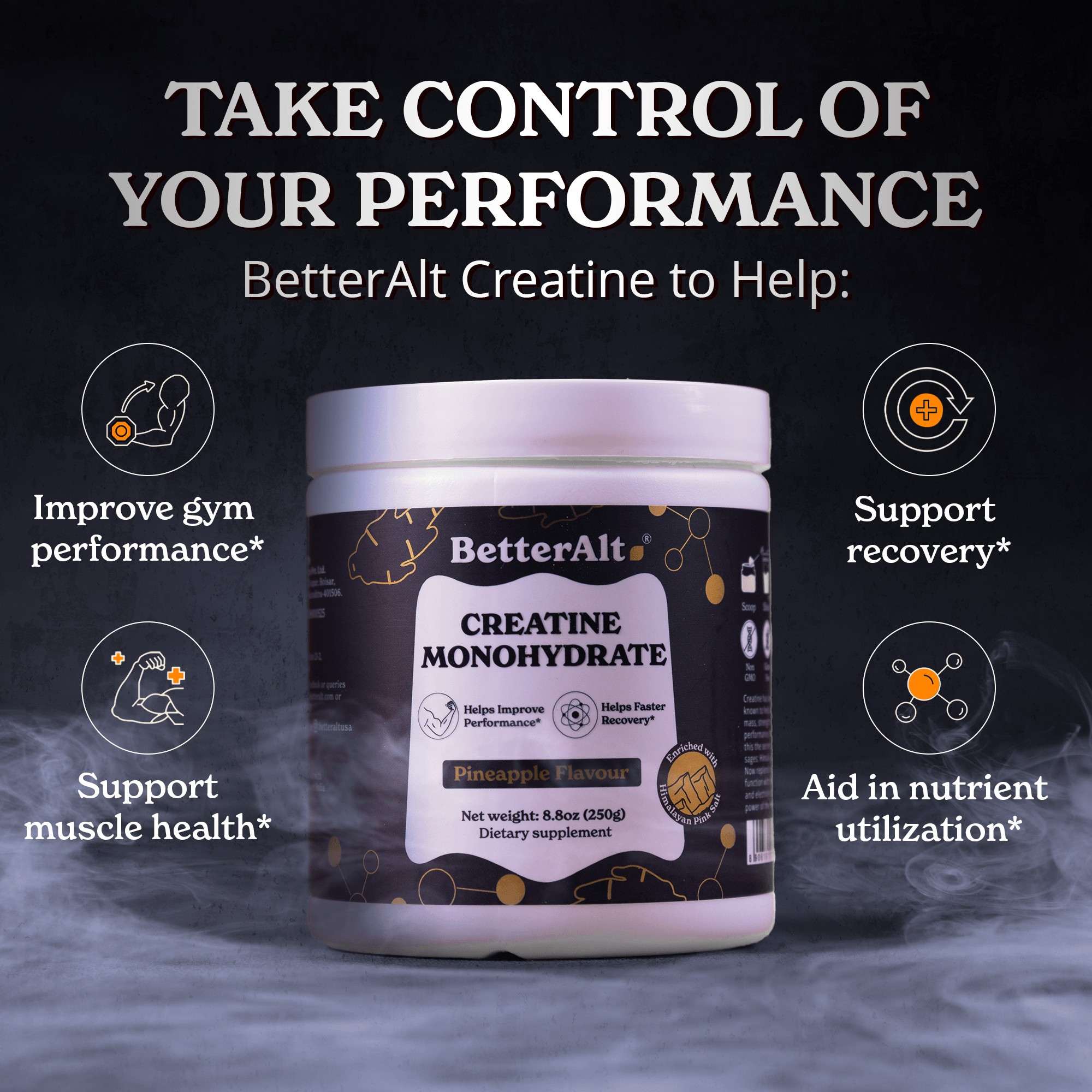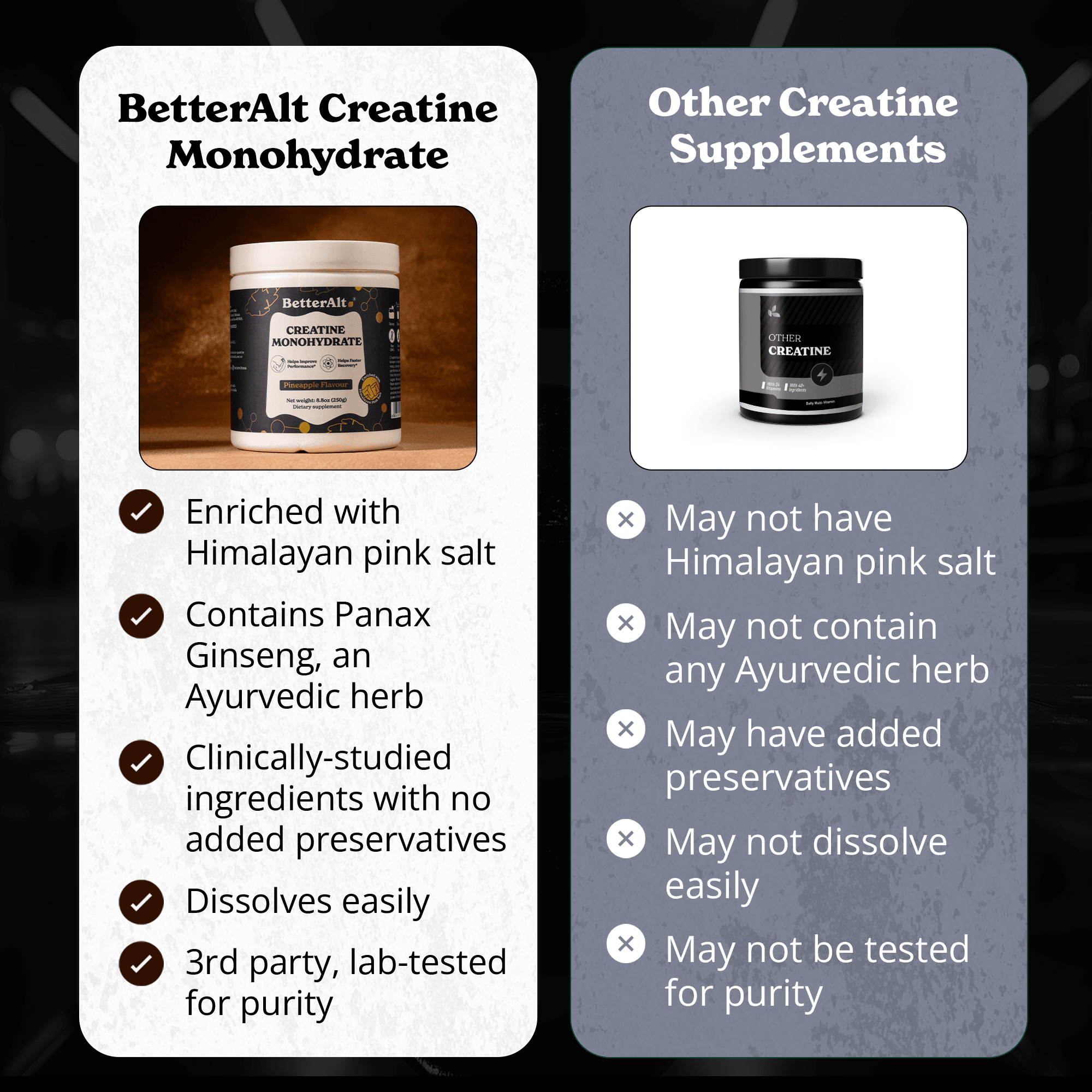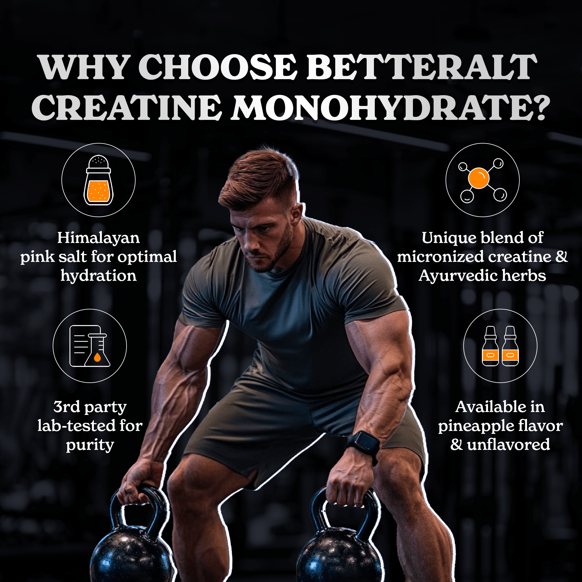 - BetterAlt Creatine Monohydrate combines science with Ayurveda to help you power through your workouts better. Formulated to help boost strength, endurance, and recovery.
