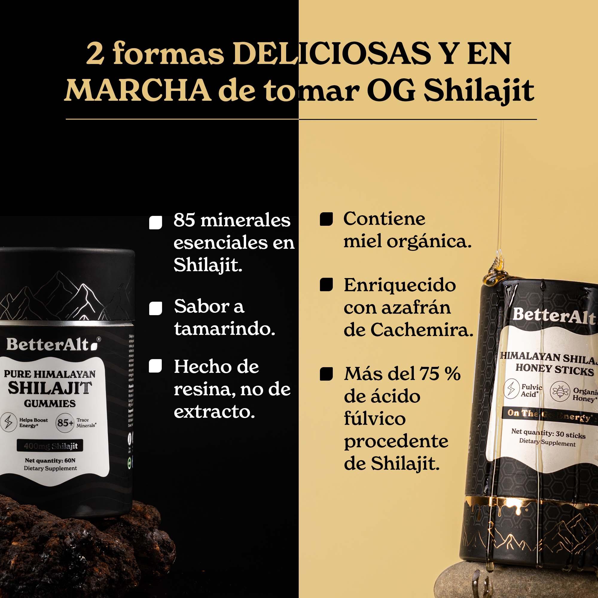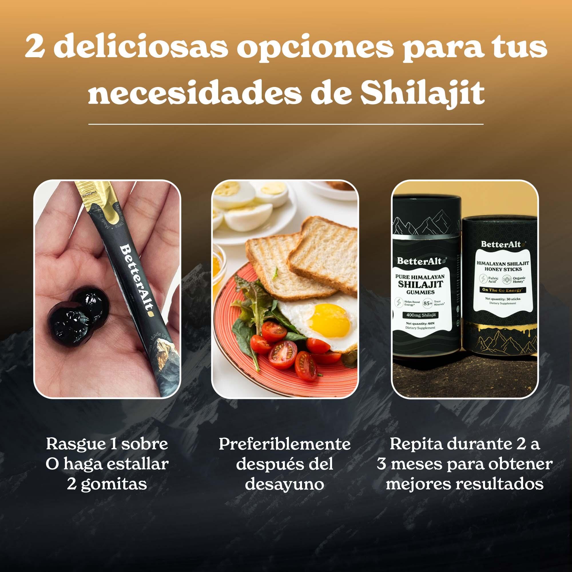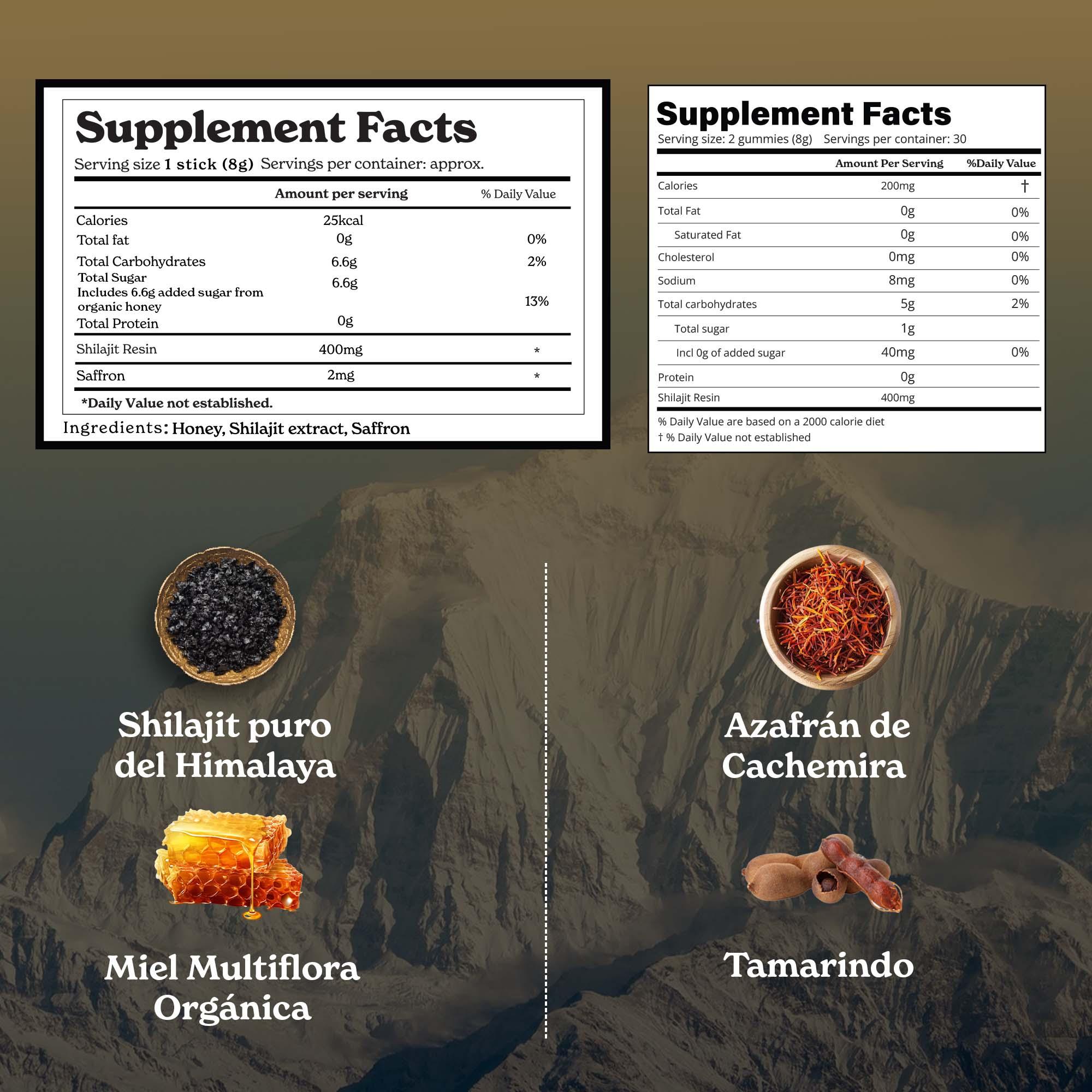 ¡Estos no son solo palitos de miel comunes! Combinan los ricos beneficios del Shilajit con la dulzura de la miel orgánica y el azafrán de Cachemira, lo que los convierte en un delicioso y nutritivo manjar.